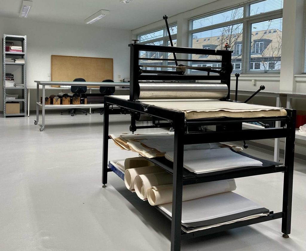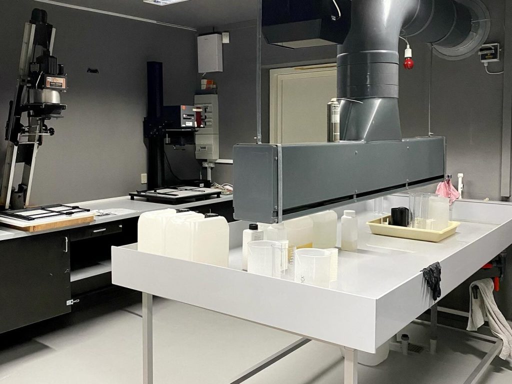 Et rum er indrettet til belysning og forarbejdning af fotogravure-plader, hvor der kan eksperimenteres med forskellige grafiske teknikker.